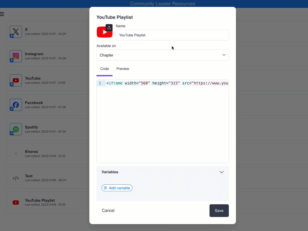 Example With a Variable: When a variable is introduced, the code becomes more adaptable. In the YouTube playlist embed code example with a variable, the static playlist ID is replaced with the variable placeholder, indicated by {{playlist-id}}. Organizers, through an intuitive interface in the chapter settings, can easily input their preferred playlist ID. This dynamic replacement allows organizers to showcase the YouTube playlist that best suits their chapter's needs.