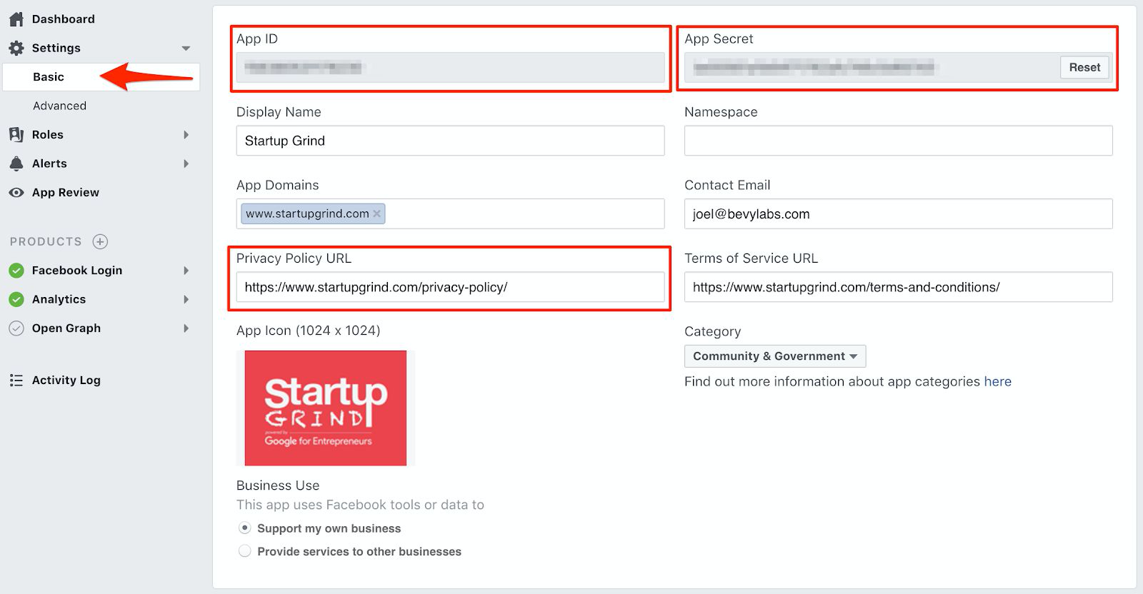 Go to the application settings, ensure you specify the link to your “Privacy Policy” page and take a note of your App ID and App Secret.