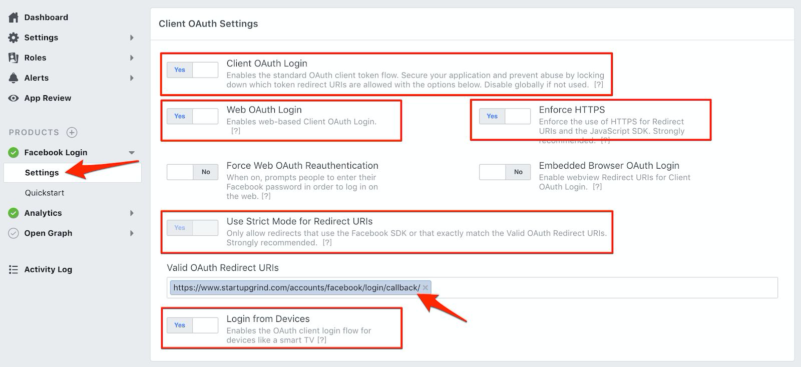 Once the app is created, you’ll have to go to “Facebook Login ⇾ Settings” and verify that the following are enabled: