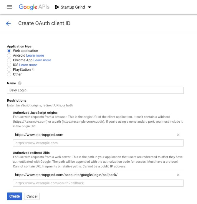 https://<your-domain>/accounts/google/login/callback/, where<your-domain>is the Bevy’s instance domain name (e.g.,https://www.startupgrind.com/accounts/google/login/callback/).