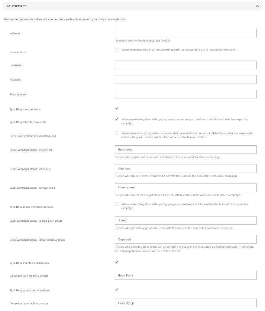Bevy needs login information associated with standard read/write access in Salesforce. If you're using the sandbox, Bevy also requires access. This login should be marked as a Marketing user and include the following object information: