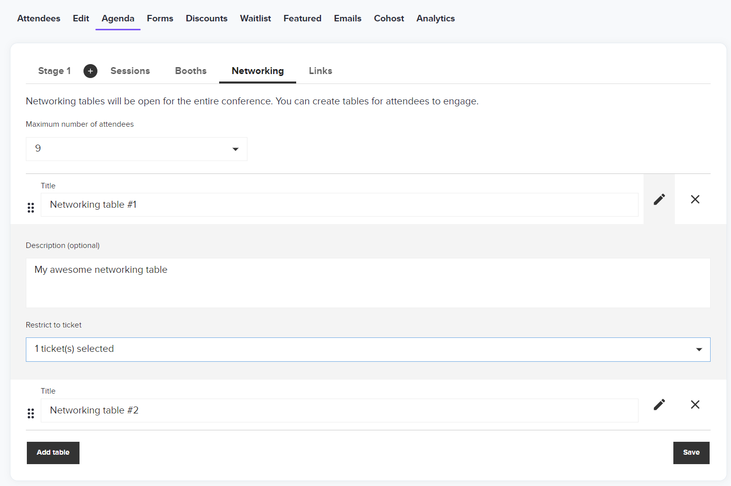- Unlimited number of tables allowed. As a host, you create networking tables in advance to give attendees the ability to find tables they are interested in during the event.