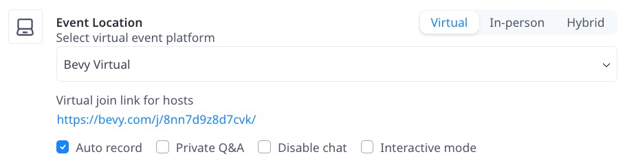 - Virtual: Events that take place on Bevy virtual meetup (BVM) or an external platform. If BVM is selected a link for the virtual event will be provided. See Bevy Virtual Meetup Settings below for additional virtual settings