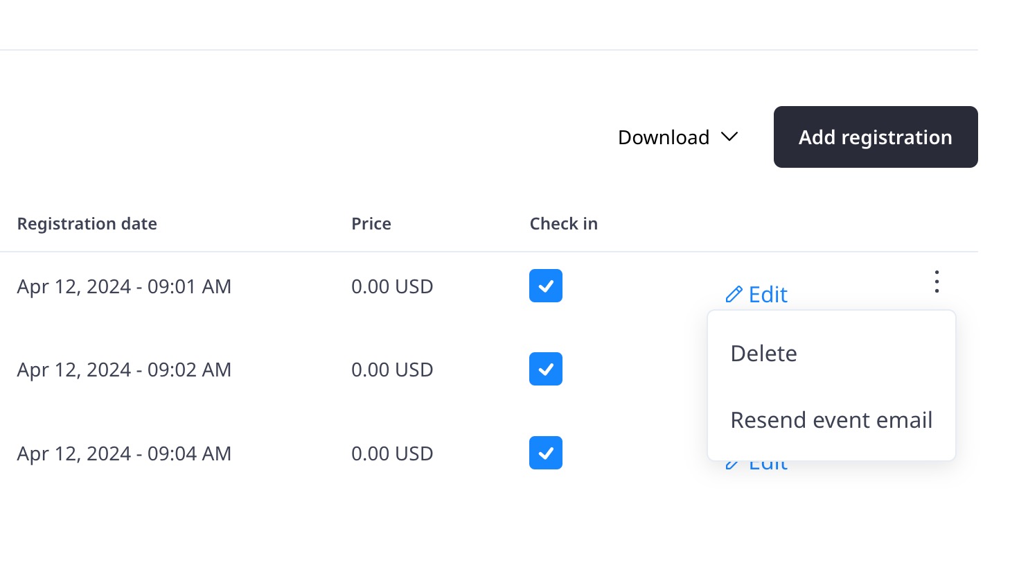 - Actions for Registrants: For each registrant, click on the menu option next to the specific registrant to delete them or resend the event email.