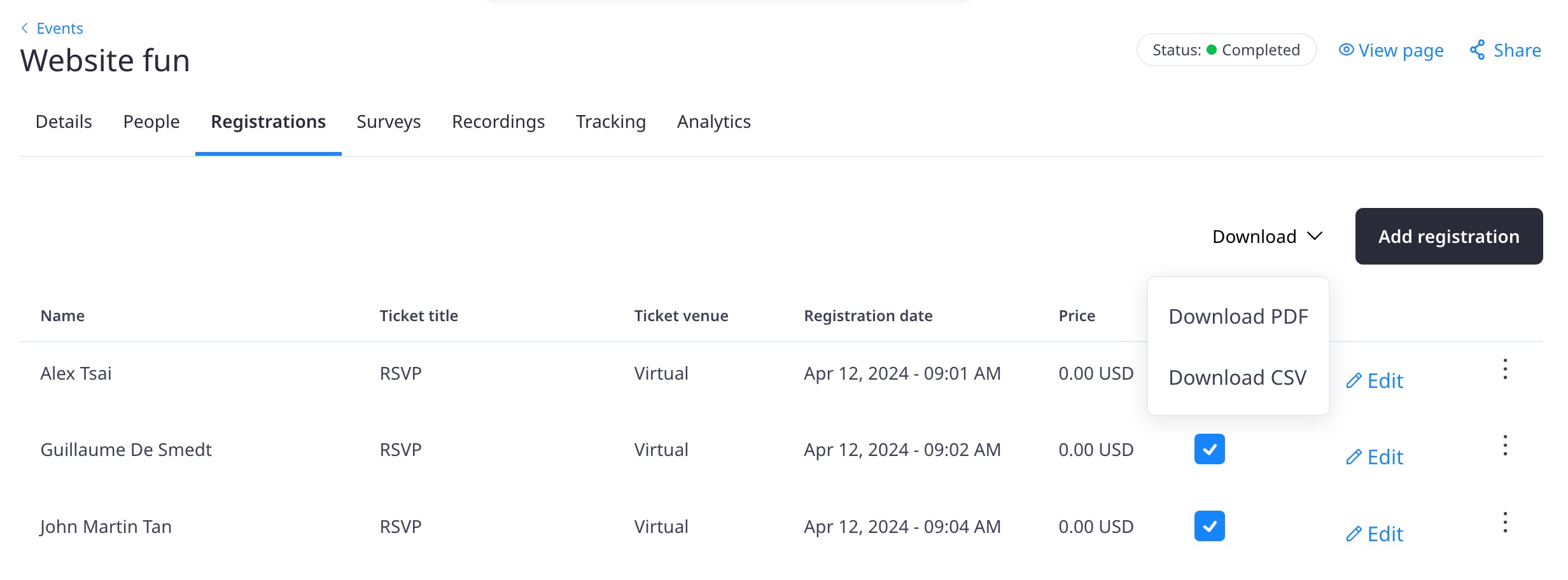PDF format is great for printing and checking people in at in-person events; use CSV to get more information than what’s listed on the Registration List page.