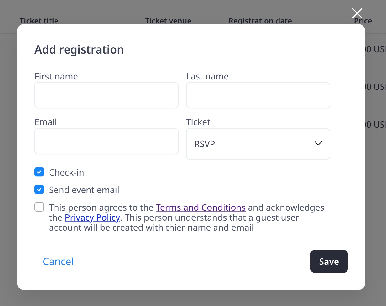 - Input the registrant's details, including first name, last name, and email, and select the ticket type associated with the new registrant.