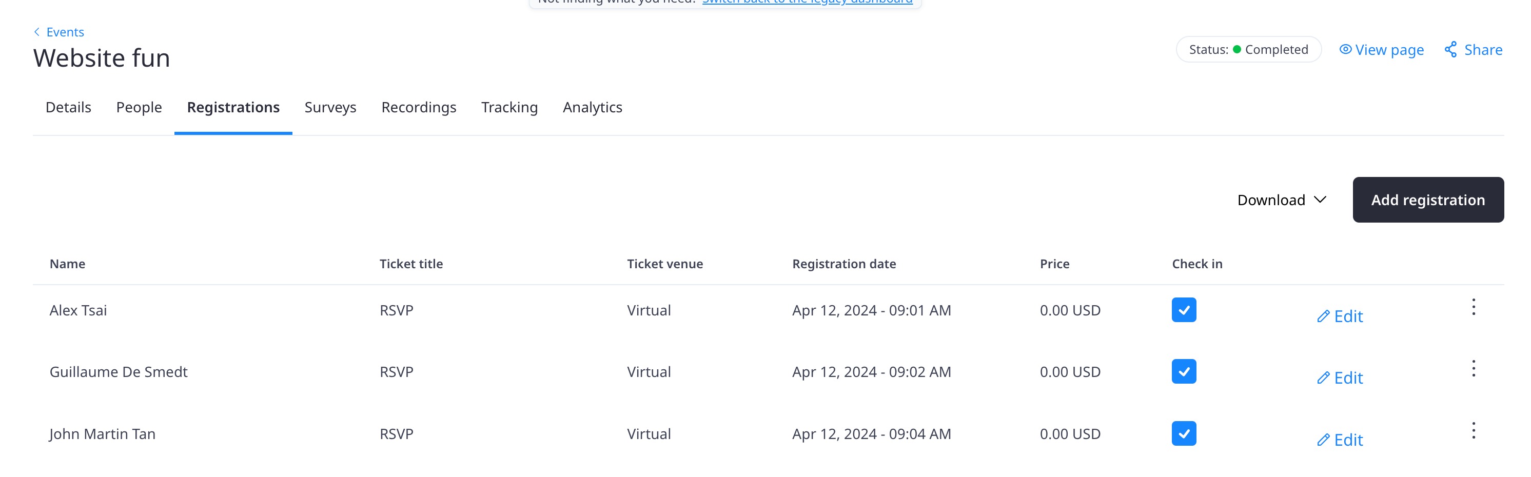 - Check-In Registrants: Organizers can mark registrants as checked-in by clicking the checkbox next to their name.