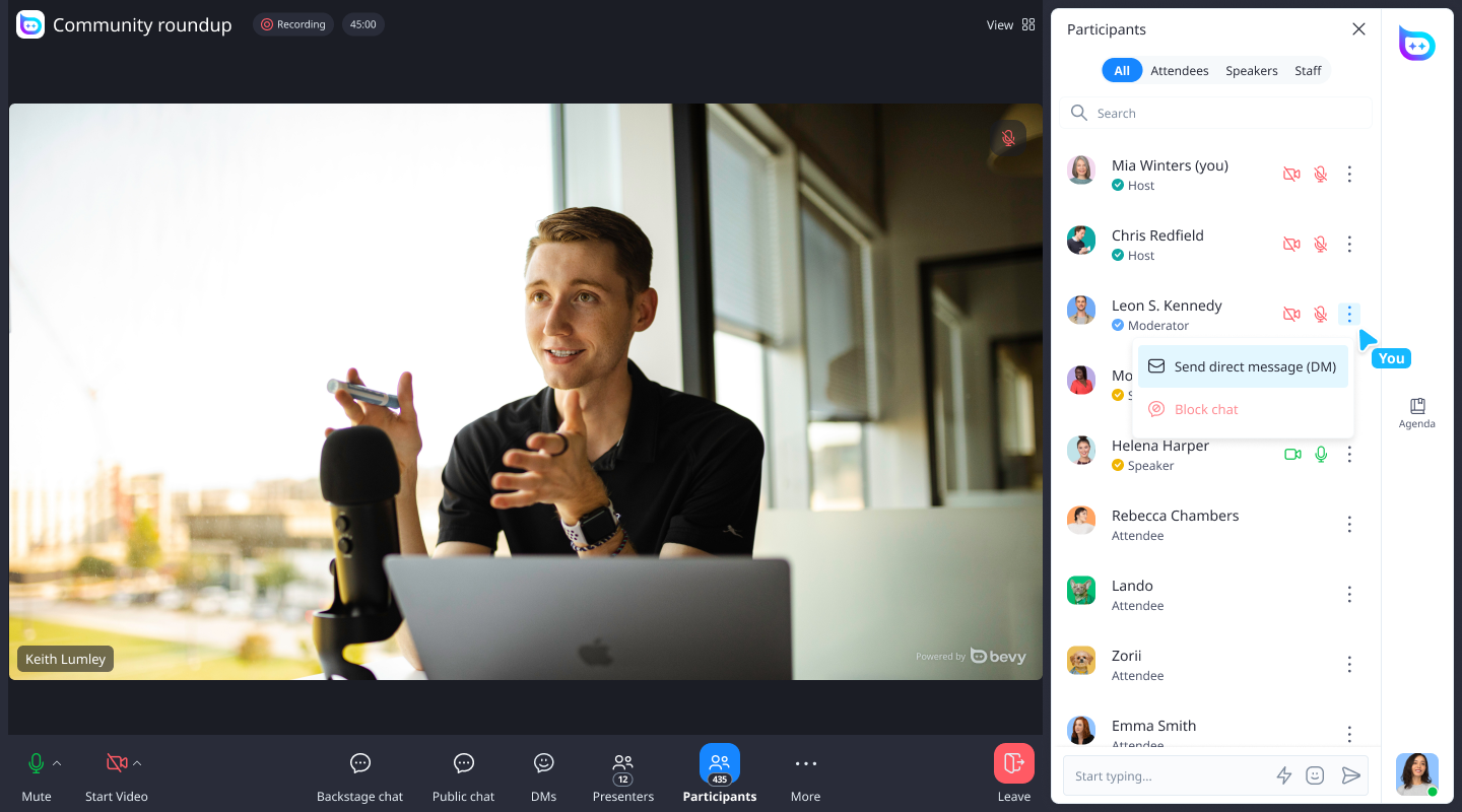 - Direct Messaging: Sending direct messages to main stage attendees is now possible straight from the backstage interface. No more navigating through multiple steps to connect—your communications are now streamlined and efficient.