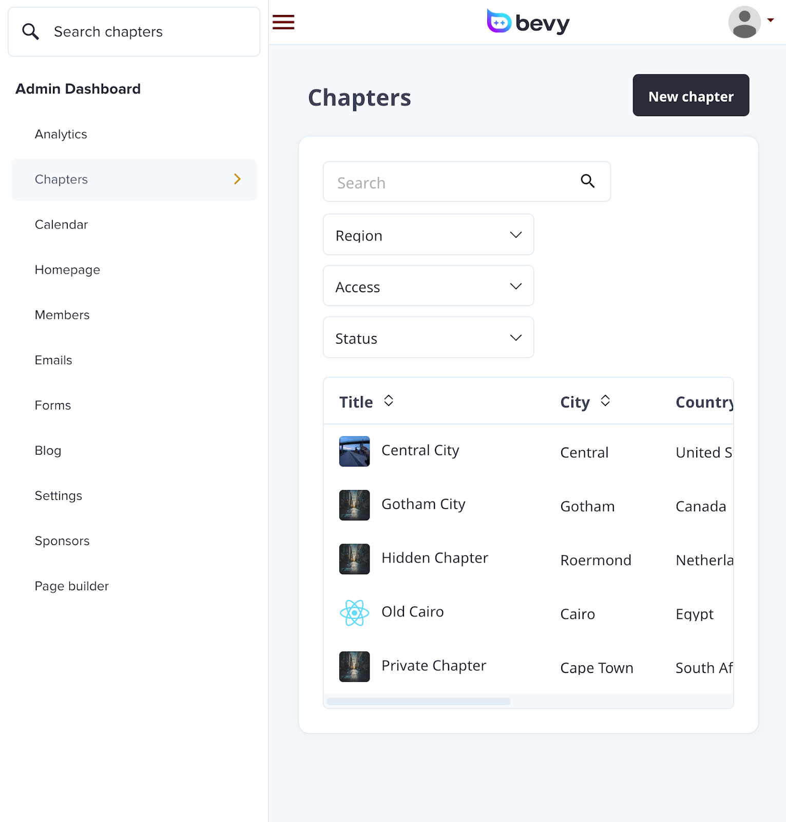 Admin Dashboard access is granted by the Bevy Support team. Chapter Dashboard access is granted to team members within the Chapter Dashboard settings.