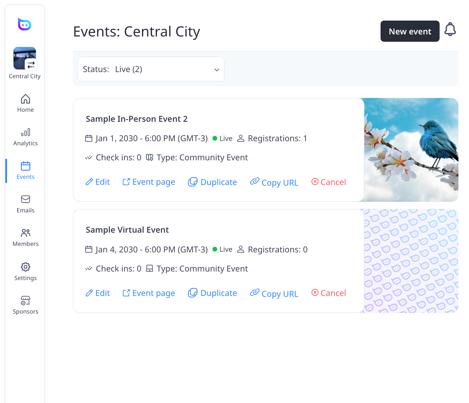 | Check-ins | Number of people who have attended an event in the selected time range. Check-ins are automatically tracked for virtual events and manually tracked for in-person events. |